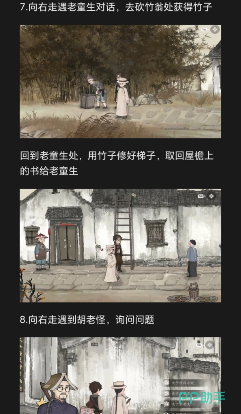 然后找铁匠,铁匠话不多但会跟说“最近有人来修过工具”,之后他会描述一下长相,心里大概有个数就行,最后找老高,老高是个热心肠,会絮叨“今早看到周老先生在水井边站了会儿”,还会说具体的时间,这个时间点一定要记牢,后面对质要用,右边线索收完再去左边区域逛,刚到左边就会碰到砍竹翁,他会跟你抱怨“竹子不好砍”,聊完了他会顺手给你一根竹条,赶紧收下等会修梯子要靠它。