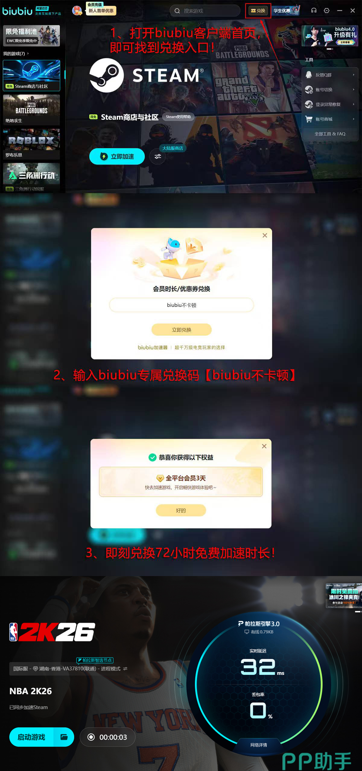 球队需要优秀的球员,biubiu同样与优秀的电竞选手Aixleft一起,对软件进行了深度优化,近期新版上线后,大家可通过【biubiu不卡顿】口令,在首页兑换1次3天的免费体验福利,如果是新人,注册后还能得到24小时福利,而整个活动期间能累积到96小时。