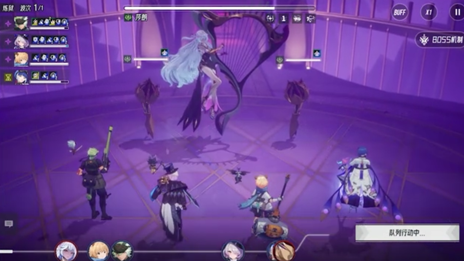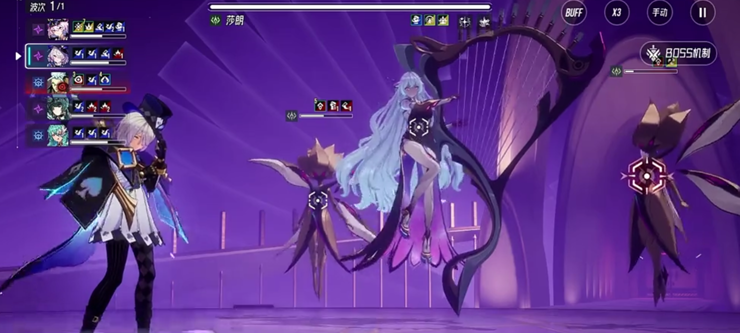 第二个boss莎朗的技能稍微复杂一点,技能小步舞曲是对敌人全体都造成350%的伤害,在此之后还会直接提升自己的行动进度自己的攻击速度也会上升,另一个技能前奏曲对所有敌方造成500%的伤害,并且有75%的几率能够将主目标行动进度击退40%并直接开始结算在目标上所受到的所有的持续伤害,被动交响曲能够在使受到持续伤害结算,让自己本身的伤害继续提升5%,叹调会附加持续伤害,而协奏剂是对全体敌方造成24%的伤害并且有50%的几率继续增加一层持续伤害,有30%的几率将主目标人物身上的增益全部消除。
