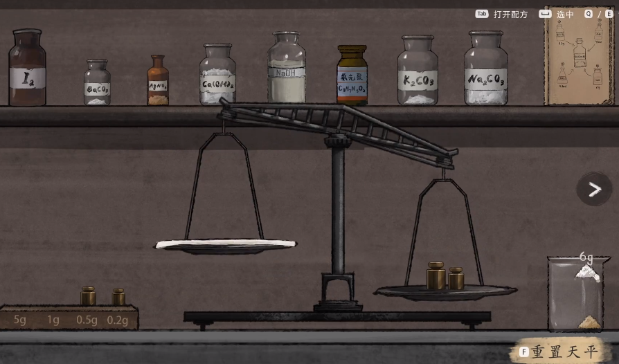 在第三个案件中,玩家会进入到工厂,在工厂这里角色意外身亡,但有其他的证据显示角色是被其他成员杀害的,为了可以找到真正的凶手,玩家需要在场景里不断搜索,同时还需要去配置一些可以显示出血迹的试剂,这时候玩家可以打开试剂台,可以看到在左侧会有砝码,上面还会有很多不同的药品,可以在右侧放置最小的砝码,然后按照游戏里提示的顺序,把药品放到左侧,然后按照要求的顺序倒入进去,所有的固体放置进去之后,就可以用试管调配液体,按照特定的重量调配完成之后,就可以获得显示出血迹的试剂。