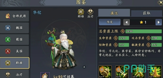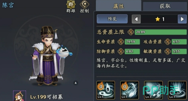 陈宫 + 甄姬 + 张春华 + 廖化 + 貂蝉可以把这一些角色搭配在一起,这一套阵容的控制链相对还是比较稳定的,陈宫并不是一开始就可以招募,而是需要玩家等级提升到199级,然后才可以招募。总资质的上限就是26.89在控制武将中属性还算是很不错的。重点就是技能机制大招就可以针对敌方全体,然后造成48%的攻击力,还会有20%的概率,直接获得三个回合的迟滞,同时还会有20%的命中加成,可以轻松的抵御敌方的闪避,保证控场并不会落空。被动技能更加的厉害。