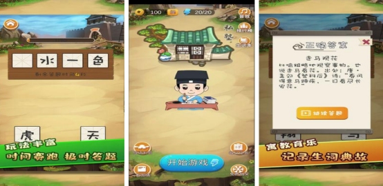 成语在我国文化中源远流长,每个成语背后都有着独特的寓意,这款游戏中覆盖了千千万万的成语知识,不同的关卡开始后都会呈现出独特的题目,有的只会看到一幅栩栩如生的图案,有的可能是由几个简单的字组合而成,而你却要根据自己看到的所有画面,猜出正确的成语。回答正确后,也可看到成语的具体寓意,能让老年人的业余生活更加丰富。