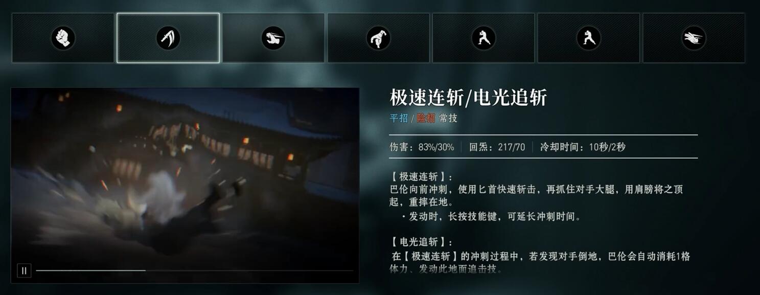 核心爆发技极速连斩具备强大压制力,点击技能键后向前冲刺并用匕首进行斩击,若命中可抓腿顶摔使目标倒地。长按可延长冲刺距离,适合追击远程对手。当目标已处于倒地状态时,技能会自动转化为电光追斩,进行低空滑行斩击,并减少自身冷却时间。需注意的是,电光追斩将消耗1格体力,这一机制让巴伦能够持续压制倒地敌人,配合极短冷却几乎可实现连续释放两次。