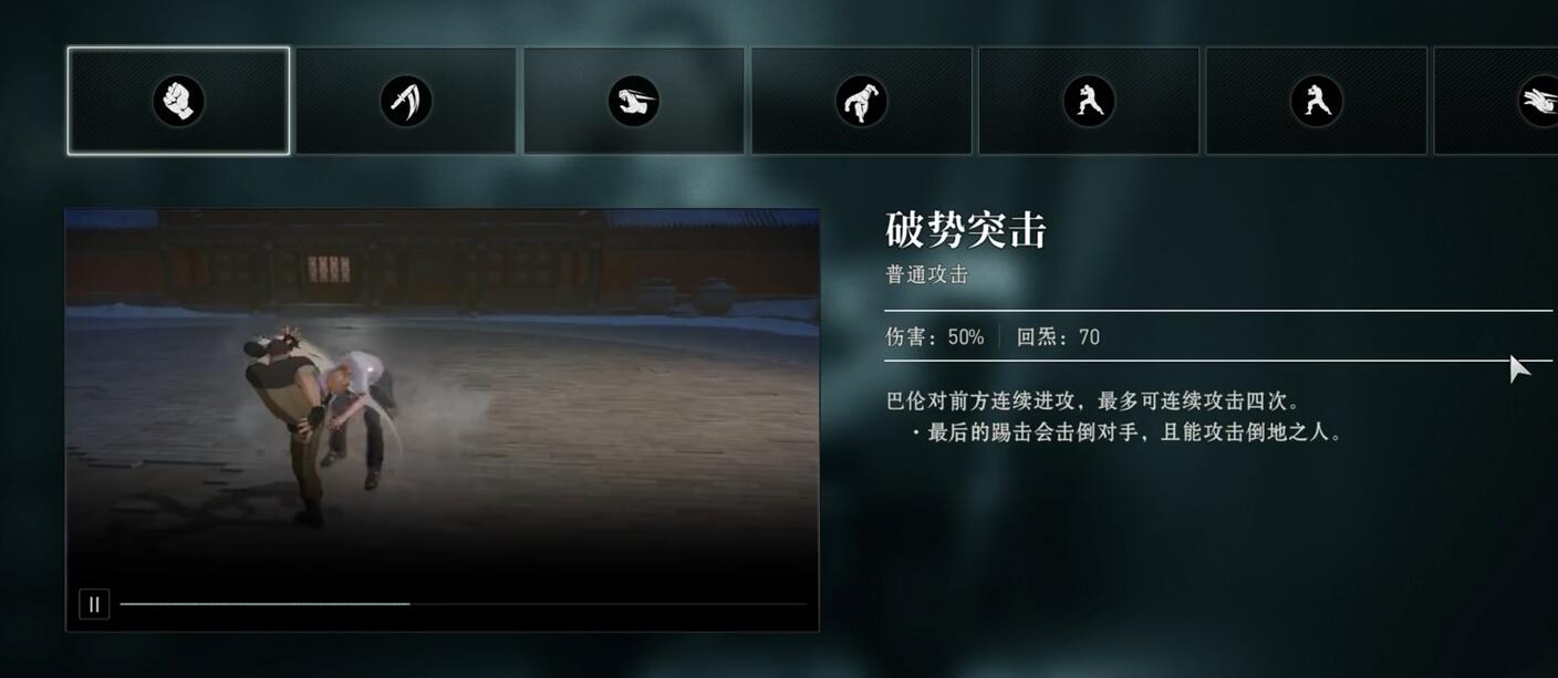 主要输出手段来自普攻技能破势突击,该技能包含四段连击:前三段为拳肘组合打击,最后一段使用侧踢将敌人击倒。但实战中并不建议强行打满四段,第三段结束后及时衔接技能更为高效。此技能基础伤害为50%,回炁70,数值看似普通,但由于冷却极短,在实际对战中手感流畅,实用性突出。推荐前两段用于试探走位,确认命中后再接后续攻击,避免空档被反制。