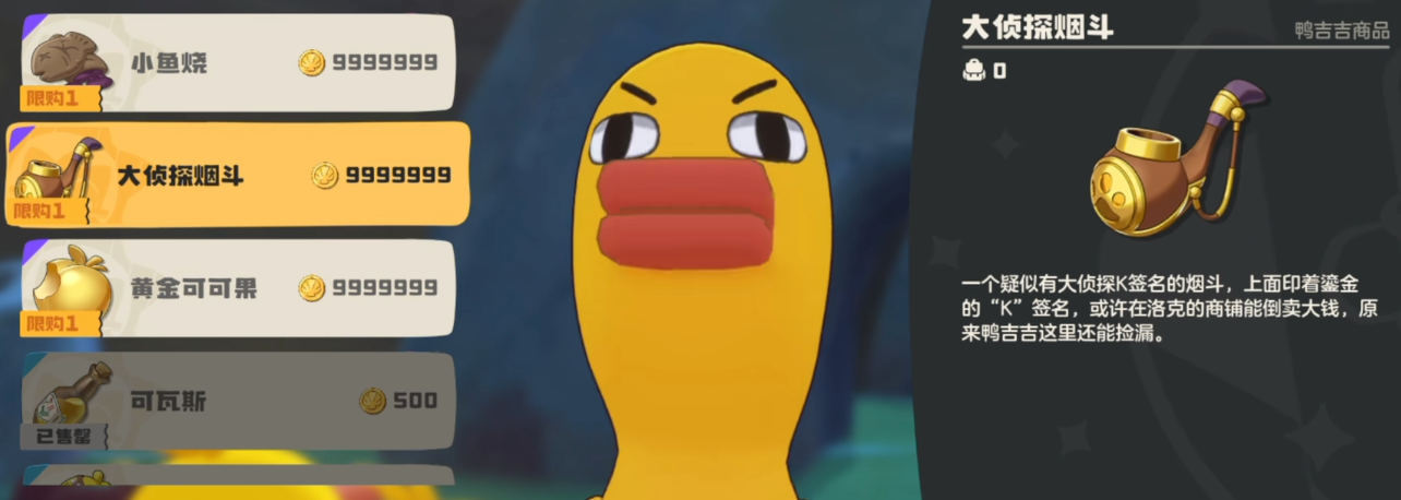 值得一提的是,测试版本中还出现了“鸭鸭商店”,玩家可在其中兑换多种道具,如价值一千万洛克贝的大侦探烟斗和黄金可可果。关于黄金可可果,目前其在背包中仅作为收藏品显示,点击查看暂无实际功能反馈,可能是内容尚未实装,也可能未来将用于特殊用途或成就系统。