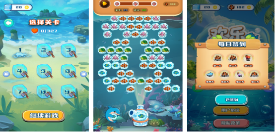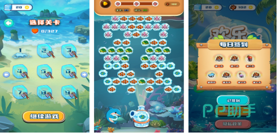美丽的海洋世界中有各种可爱的小动物们,比如八爪鱼或者海龟等等,这款游戏对于玩家的经验值并没有任何的要求,就算是零经验的玩家也可轻松畅玩,从整体上来看又和泡泡龙特别相似,因为从题目的最上方会不断涌现出各种海洋生物,而这些海洋生物的位置,都是被随机打乱的,最下方又会随机弹出任意的海洋生物拟精准瞄准,将相同的海洋生物发射在一起,即可完成消除。