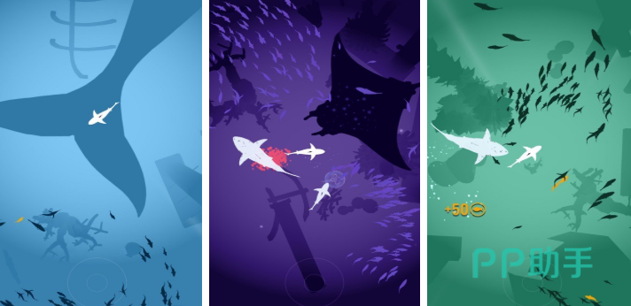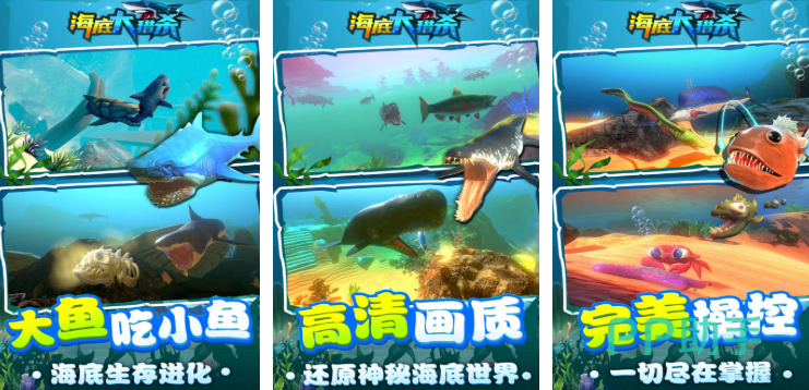 海底大猎杀刚开始只能操控小鱼在浅海游,周围全是比自己大的生物,得小心翼翼躲着金枪鱼,它游得特别快一追上就会把小鱼吞掉,只能偷偷吃水里的浮游生物,吃够了能量就能进化,从沙丁鱼变成三文鱼后游得更快了,还能冲刺躲开天敌,再进化成鲨鱼就能主动攻击其他鱼,一口能吞掉好几条小鱼。