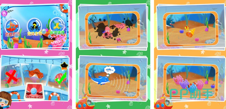 贝贝探索海底世界手游特别适合小朋友,可以操控贝贝在海底逛,点一下小丑鱼它就会绕着珊瑚礁转圈还会吐泡泡,滑动屏幕摸海龟,它会缩到壳里过一会再慢慢伸出来,攒够星星能解锁新地方,去深海看会发光的灯笼鱼,去极地看可爱的企鹅,还能玩小游戏拼生物拼图或者消除泡泡,玩游戏的时候还能听语音介绍。