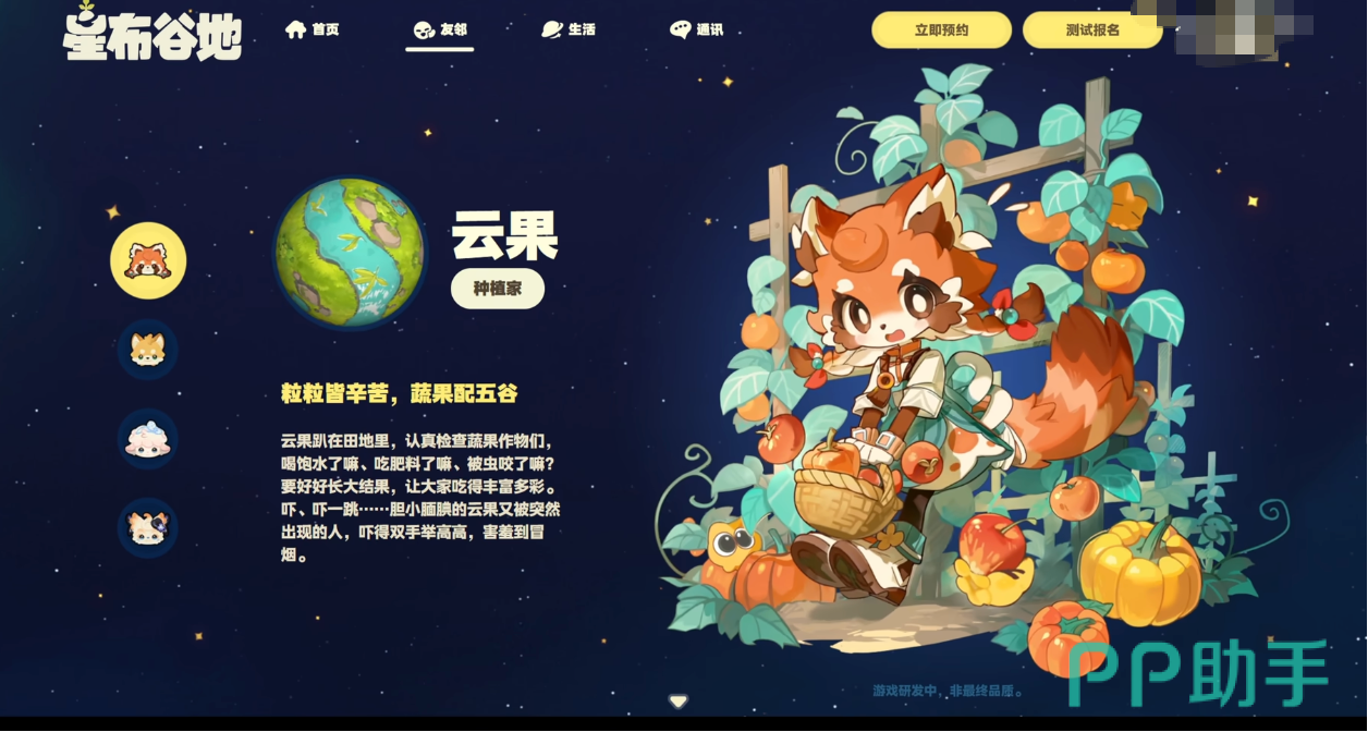 云果是个女性角色,职业为一名种植家。名字来源是传统种花文化,性格胆小又腼腆,平日的爱好就是照料各种蔬果作物。外表是橙色的狐狸拟人,有着毛茸茸的狐耳和一条大尾巴,设定萌萌又可爱。
