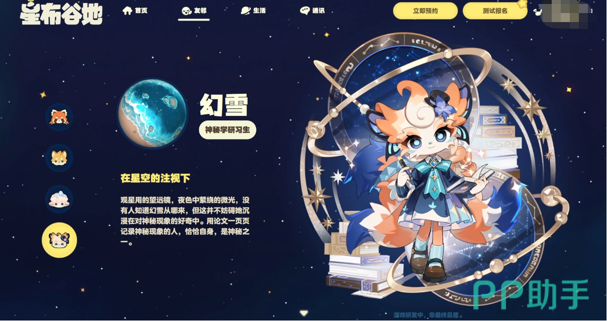 幻雪的人物立绘充满的神秘学的元素,外形是九尾拟人的形象,人物本身的职业是神秘学研习生,痴迷于研究宇宙里的各种神秘现象。她的来历本身也是一个迷,据说她本身就是神秘的其中一份子。她的衣着都和占星元素有关,深色星空的裙子上布满了小星星。