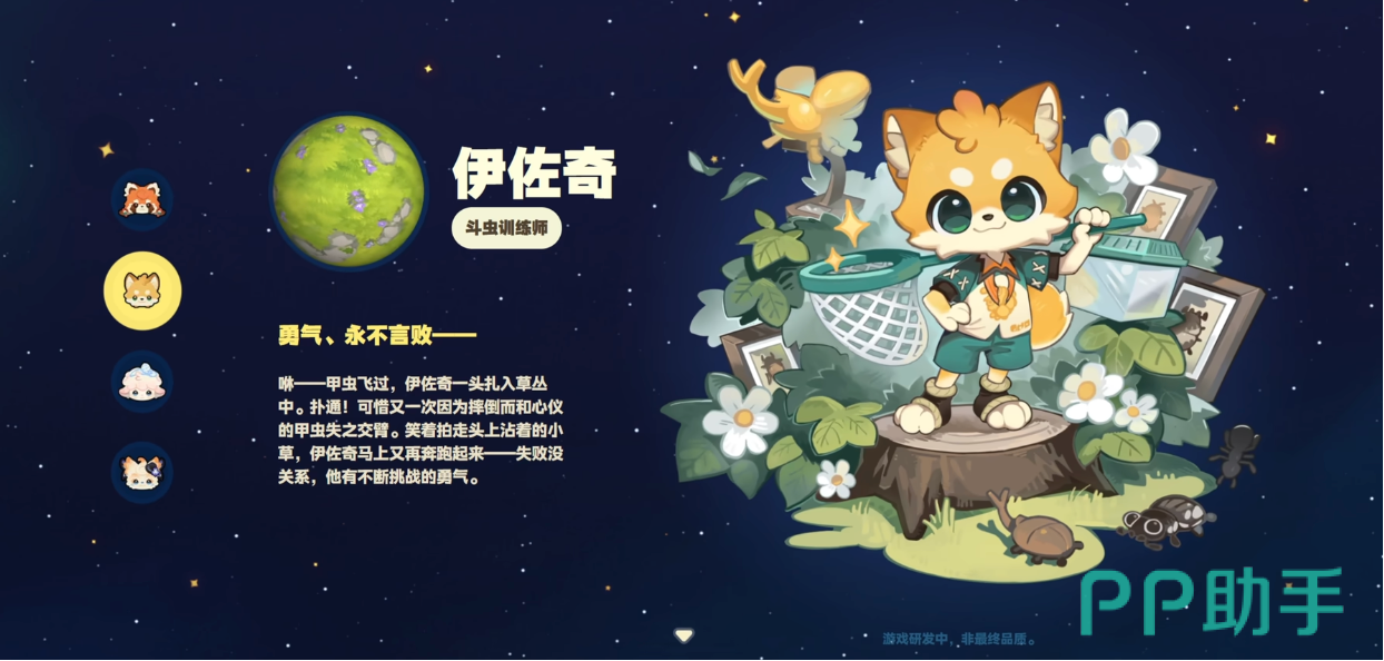 另一名人物叫伊佐奇,是男性角色,职业设定是斗虫训练师,性格勇敢又乐观,对捕捉甲虫特别热衷,他的座右铭是永不言弃,抓不到虫子就再次努力,这个人物日常背着一个扑虫网,身着蓝绿色运动套装,是浅黄色狐狸的造型,活力十足。