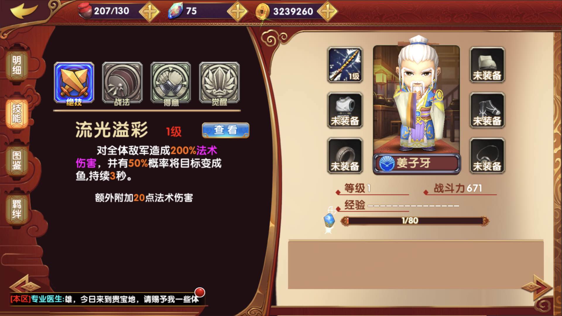 1.流光溢彩:对全体敌人造成百分之200的伤害并且有百分之50的几率全部变成青蛙,这个技能和贾宝玉的大招有点像,效果还是比贾宝玉差一些,不过姜子牙的基础属性实在太高了,因此强度远超贾宝玉。
