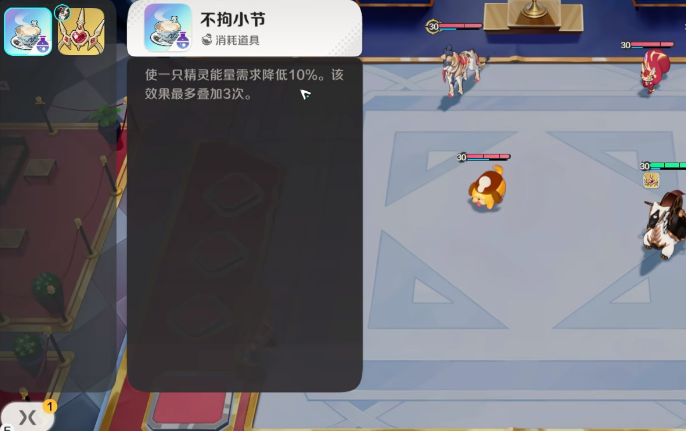 在这个基础上还可以使用不拘小节这个道具,有了这个道具之后,能让场上精灵对于能量的需求降低10%,战斗的时候能保证这些角色全力输出,不会受到其他因素的影响,每次使用最多还能叠加三次,非常适合叠加到大海龟身上,两个角色联合起来,一个抵抗对手的攻击,一个在后方输出,能保证整个队伍的战斗力。