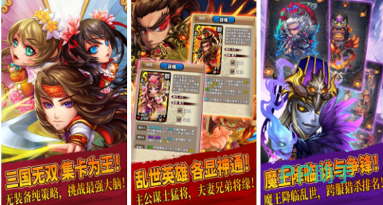 有较多我们熟悉的英雄人物,再次重温经典的三国剧情,独特的纯卡牌模式,摒弃了严重氪金的游戏弊端,而是需要投入足够智慧,合理排兵布阵,根据具体的地形制定相应的策略展现出你的兵法,这样才有机会获胜。在此三国游戏中可享受公平的竞技环境,除了有三国英雄之外,还有魔王降临,与魔王共同对决比拼排名。