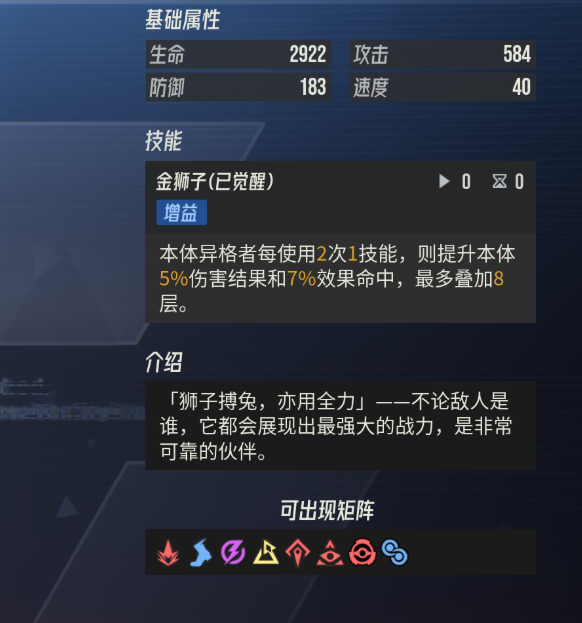 金狮子的核心亮点在于其特有的增益叠加机制:每当释放技能后,会为自己增加一定比例的伤害输出与效果命中率,且该增益可多次叠加。依托这一特性,配合自身较高的暴击基础值以及具备追击能力的技能设计,使其能够在持续作战中迅速累积战斗优势,实现爆发式输出。