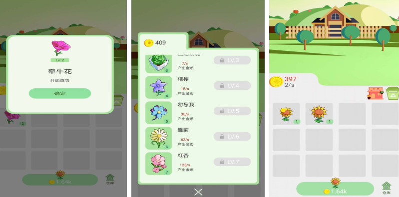 画面风格温馨治愈,背景为一片盛开的花园。玩家通过合并同等级花朵推进升级,例如两朵雏菊合成月季,两朵月季合成玫瑰。高阶花卉可解锁花园装饰选项,布局高度自由,可按个人喜好排列花坛形状,添加路灯或铺设石子小径,打造理想中的美丽庭院。