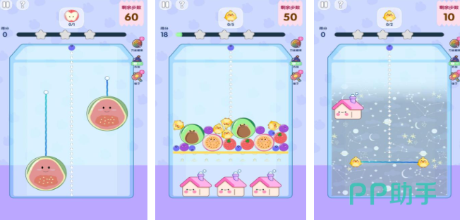 支持多主题切换,包括水果、动物、建筑等不同风格,画面随主题变化而调整。无论选择哪种模式,核心机制保持一致:相同等级的物品可合并升阶。例如水果主题中两个苹果合成菠萝,动物主题里两只兔子合成狐狸,建筑主题下两个木屋合成别墅,每次合成均有对应特效呈现。