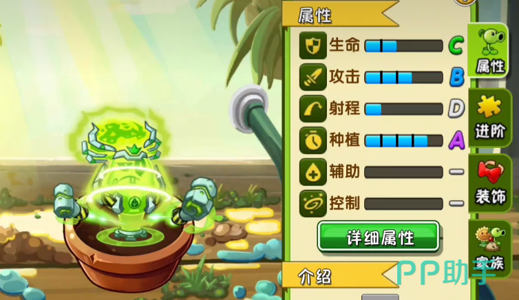 除了常规的技能之外,这个植物还会有特殊技能,可以在战斗的时候使用上勾拳攻击,想要触发这个技能,要连续击中对方15次,这样触发上勾拳之后,除了常规的伤害之外,还可以直接把僵尸击退,并且造成额外伤害,另外在攻击过程中,还可以使用撼地拳进攻,使用这项技能攻击的时候,会连续触发两次上勾拳,这时候角色会在原地跳起,下落过程中会触发这项攻击,能让每一个受到攻击的僵尸被眩晕,想要更好的触发这项技能就可以搭配坚果,坚果可以在前方抵抗,菜问能躲在坚果的后面进攻,这样可以避免受到大量僵尸的攻击。