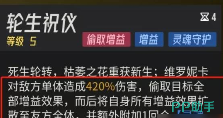 终极技能方面,维罗妮卡的大招冷却时间为四个回合。蓄力释放后,可对单个敌人造成高达420%攻击力的爆发伤害。此外,该技能还能剥夺目标身上所有增益状态,并将这些效果转移至我方全体成员,实现资源逆向利用。同时附带灵魂守护效果,可在短时间内恢复队友生命值,显著提高团队整体的抗打击能力。这一机制使她在高阶对战中成为兼具控制、反制与支援能力的核心角色。