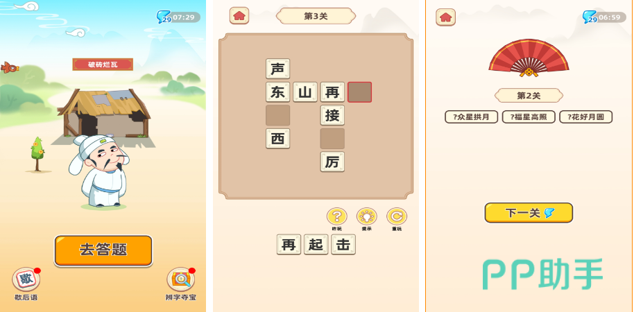 《拼音猜词语》是一款看上去很普通的休闲游戏,但是当你玩的时候你会发现你的大脑正在飞速运转的一款小游戏,通过给出一些拼音提示来猜测对应的词语,随着难度等级越来越高相信很多玩家都会觉得这样的拼拼音小游戏好像没有什么可以学到的东西吧?但其实仔细想想,这个游戏也在无形中锻炼着你的语言记忆能力以及拼音拼写能力,甚至是对于一些汉字文化都有了更直观的感受和理解。