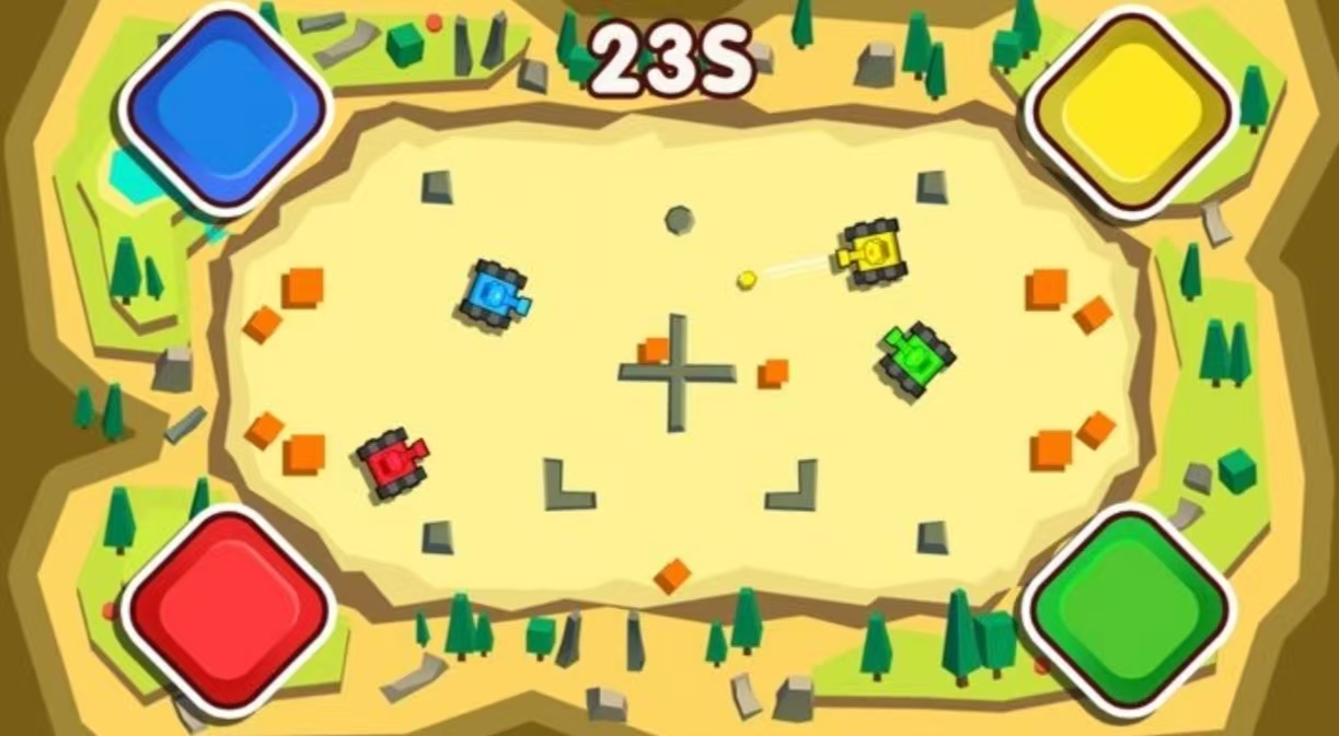 《四人坦克大战》是一款专为聚会设计的休闲对战游戏,玩法直观易上手。四位玩家各自操控一辆坦克,在战场上进行移动与射击。通过点击按钮发射炮弹,精准命中敌人即可得分。坦克支持360度旋转,玩家需随时调整方向和角度以应对战况。地图中分布着各类障碍物,既可作为掩体规避伤害,也可用于布局伏击,增加了策略性和可玩性。
