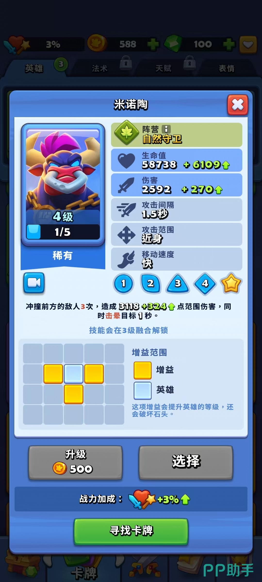首选推荐的是米诺陶,这位蓝色品质英雄在游戏前期即可获得,尽管稀有度不高,但其作为前排抗伤单位的表现十分出色。他具备蓄力冲锋技能,能击退路径上的敌人并造成眩晕效果。当处于被包围状态时,米诺陶会获得减伤与回复提升的增益,在完成超级融合后,其实力进一步增强,足以有效阻挡多数前期攻势。