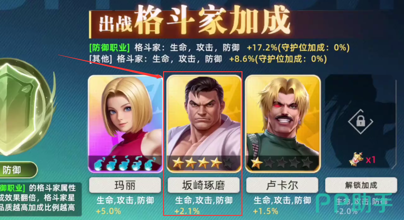 坂崎琢磨在游戏内的定位是防御型主坦,拥有极高的防御属性加成,如若和防御职能格斗家一同出战,可以获取2.1%的生命值、攻击力、防御数值加成栋号同时,当所有防御职能全部出阵时,整体的守护者加成将会提升到17.2%。