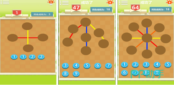 该游戏适合广泛年龄段的孩子使用,规则清晰易懂,关卡设计由浅入深。每个任务都有明确目标,例如要求同色连线上的数字之和等于3或18等。画面中以彩色线条连接圆形节点,玩家需要将底部提供的数字合理填入圆圈中,达成指定条件后即可顺利通关,提升计算与观察力。