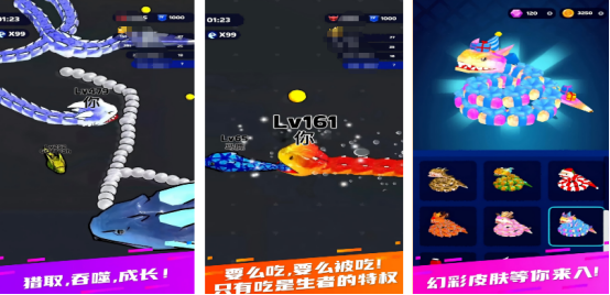 从玩法上来看,和贪吃蛇玩法特别相似,支持了多人共同体验,您在开局后将要化身成为一条特别灵活的小蛇,从一条较小的蛇逐渐长成整个领域中的巨无霸。在此过程中还要竭尽全力去让自己的蛇身和其他的蛇头发生碰撞,这样就能够将其的能量点全部吞噬,成为整个地图场景中的巨无霸。