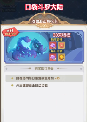 这里先跟大家说一下魂兽追击特权卡,这就是一个关键的道具。在拥有之后,那猎魂药剂基本上每天恢复量都可以增加10,还可以开启自动追击功能。猎魂药剂在抓捕魂兽时就好像是门票一样恢复的快,那就意味着抓捕的次数也会增加。自动追击功能还是比较省事的,不需要一直手动操作,可以帮助大家节省很多的精力。要是没有这张卡,想开启自动追击是不行的,所以有条件的话,那一定要选择入手这一张卡。