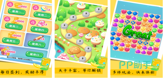 人们对于甜品都没有任何的抵抗力,而这款游戏就是以各种色彩缤纷的甜品组合而成。丰富的关卡内容都等待大家逐渐解锁,每个关卡中的甜品都有各种障碍物,在消除时并不是一帆风顺的,比如在有些甜品上,还会被各种栅栏所困住,首先要将栅栏拆开之后才可完成消除。