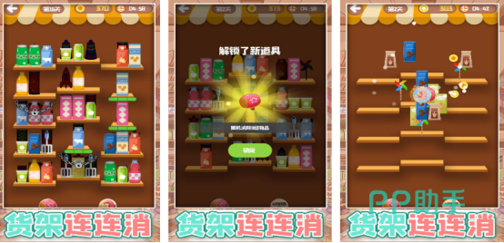 错综复杂的货架上,有各种琳琅满目的物品,可能每个货架上,都会有三个不同的物品,而这些物品的位置都会被随机打乱,大家要仔细滑动屏幕并仔细观察,将三个相同的物品放置在一个货架上,即可快速消除。其中也提供了大量的辅助道具,帮助大家顺利闯关。