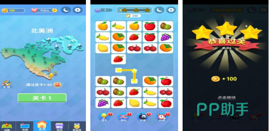 早在手游刚刚创作的时候,连连看玩法就深入人心,覆盖了所有的人群,而这款游戏也是如此涵盖不同的主题,比如可在北美洲或南美洲中,完成相应的消除。任务在上下屏幕中都会有不同的水果图案,比如猕猴桃、香蕉等等,可通过转折的方式,将两个相同的水果图案连接在一起快速消除,下方还会提供很多辅助道具,比如增加时间以及炸弹等。