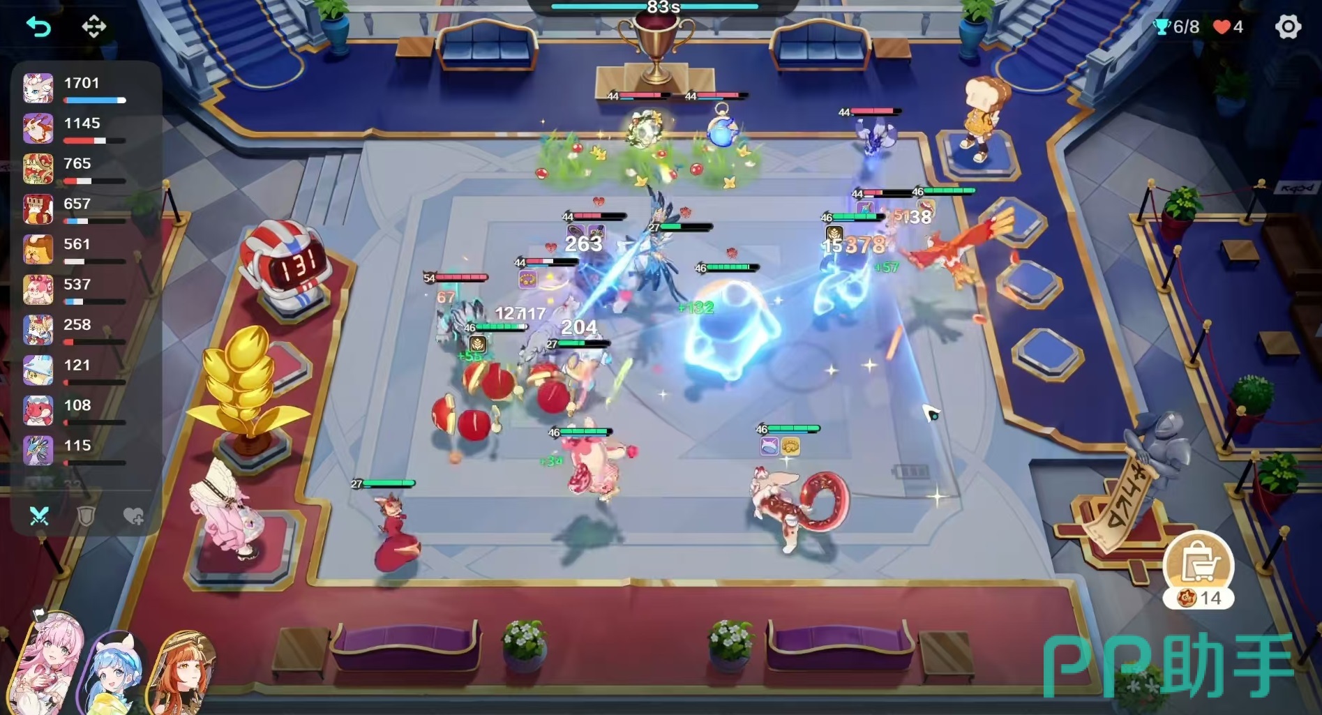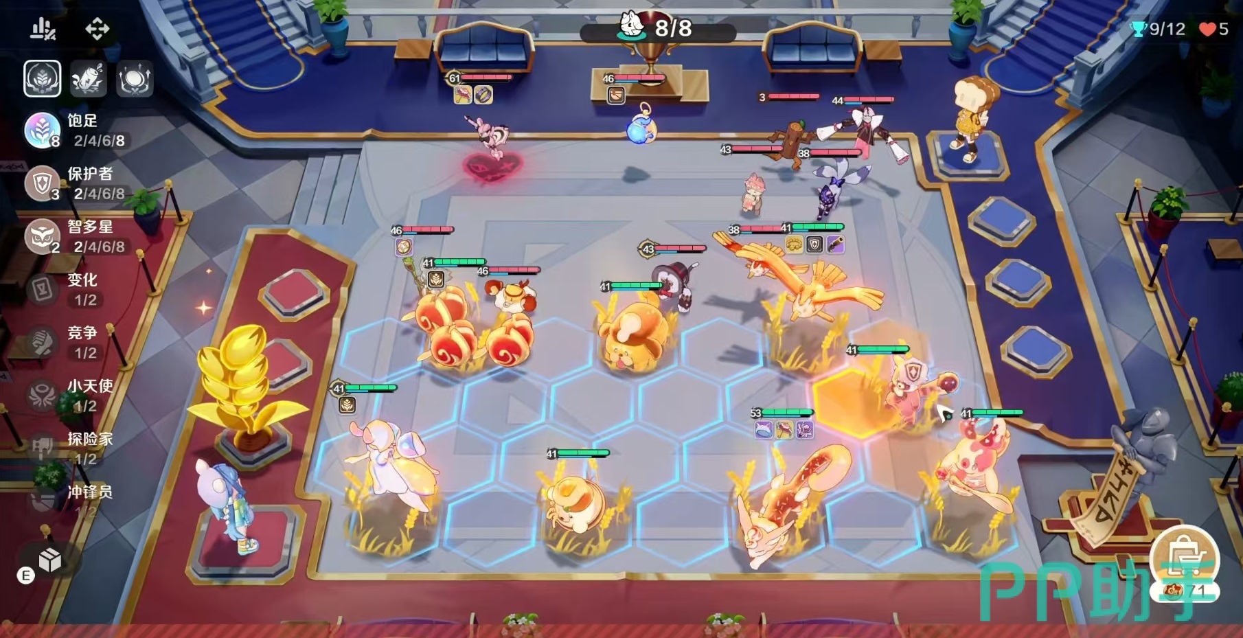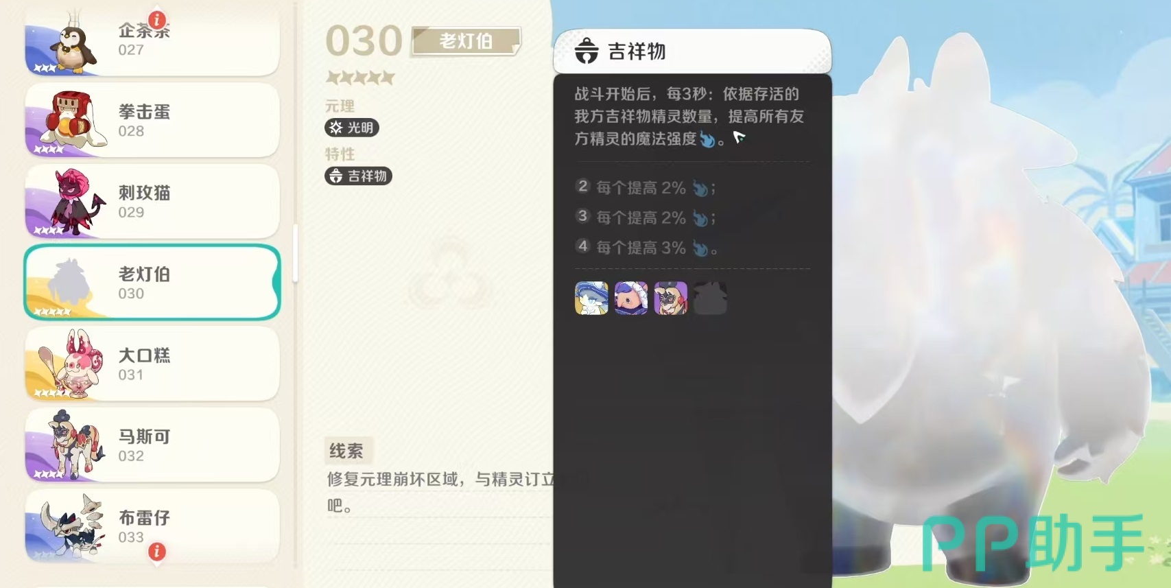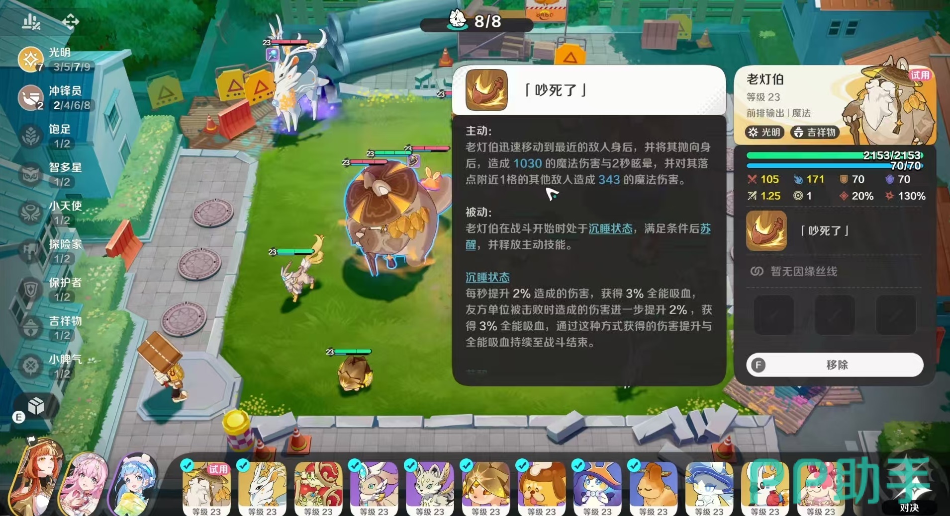 此外,老灯伯所拥有的“吉祥物”特性也提供了团队增益能力:每三秒根据场上存活的我方吉祥物精灵数量,提升全体友军的魔法强度。当凑齐四吉祥物羁绊时,队伍整体法术输出将显著增强。尽管目前吉祥物系列仅有四位成员,全员上场有一定难度,但即使组成两羁绊也能发挥一定辅助作用,适合作为体系补充融入多种阵容。