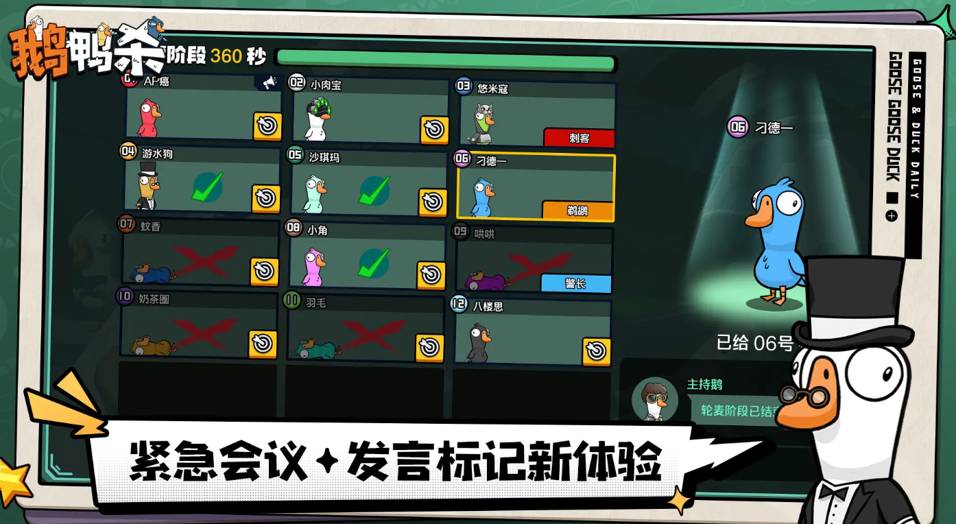 值得注意的是,每次紧急会议限时360秒,玩家必须在此期间内分析线索、标记可疑对象,并通过投票将其驱逐出舱。游戏内设有刺客、警长、鹈鹕等多种身份,每个身份具备不同的能力,需谨慎辨别身份真伪。