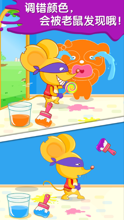 这款游戏是专门给初认识颜色的小朋友设计的,它会带着大家一步一步的探索色彩的奥秘。教个孩子怎么去混合颜色,怎么调出新的色彩。在玩的时候就像一个小画家一样,自己动手调颜色特别有趣,游戏里还有很多好玩的故事:小熊猫妖根据要求调对颜色,不然棒棒糖就要被坏老鼠抢走了。除了调色游戏里,还有很多魔法药水,每一种药水都有很神奇的效果,等着大家去发现去尝试,大家快来体验吧。
