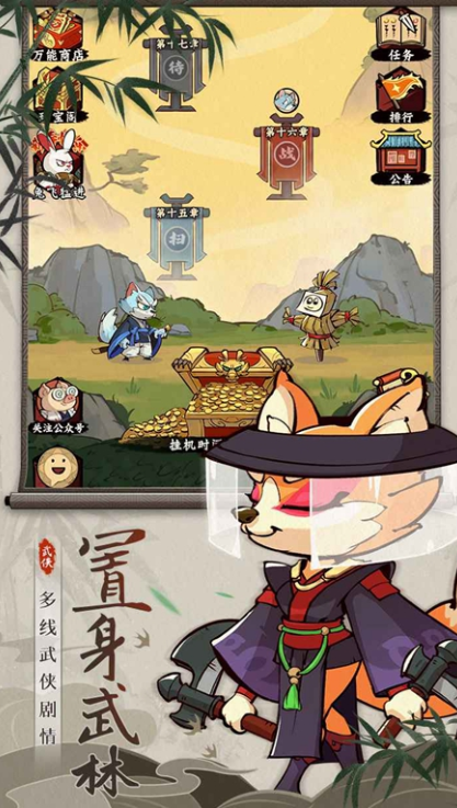 这款游戏能玩的方式比较多,玩的时候既能感受到乐趣,又能让身心放松,不用花太多精力在上面。它的故事发生在武侠世界里,把武侠相关的内容和萌萌的动物样子结合到了一起,做出了好些特别又有意思的角色,能让玩家体验一次不一样的武侠之旅。在游戏里能碰到很多武侠英雄,还有64种武功可以学,这些武功可以随便搭配,做出只属于自己的武功路数。