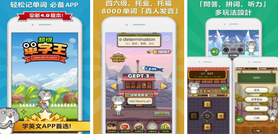 假如想要学习英语,那就可以尝试一下超级单词王,这里面会有很多不同的难度可以选择,接着就可以带领一只小猫在游戏里不断完成挑战,每次挑战的过程中,都需要把各种英文单词进行合理的顺序排布,同时还需要在空位上填写字母,每次挑战完成之后都会给出单词的意思,还会有纯正的真人发音,能以更加趣味的方式记忆这些单词。