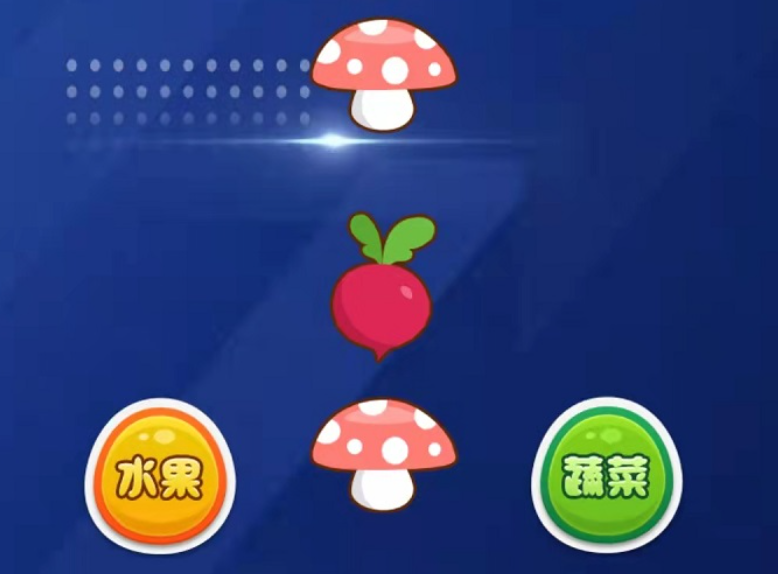 这款游戏需要玩家识别落下的物品属于水果还是蔬菜,然后快速进行选择,如果选择正确可以获得奖励,选择错误则需要接受惩罚。这是一个很适合宝宝进行识物训练的游戏,画风可爱,玩法简单,可以很好地锻炼宝宝的判断能力,也能让宝宝认识更多蔬菜水果,是一款可以让家长放心的游戏,虽然简单,但也很考验玩家的反应能力,各位玩家也可以来挑战看看自己的判断力和反应力有多厉害吧!