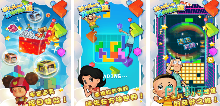 新大头儿子之方块环游之旅把消除和环游世界结合在一起,打开游戏就能看到大头儿子背着旅行包,站在世界地图前准备开启旅程,每个城市都是一个关卡,北京关卡的背景有天安门,巴黎关卡能看到埃菲尔铁塔,特别有地域特色,玩的时候就是经典的方块消除,用手指交换相邻的彩色方块,三个一样的连在一起就能消除,消除越多攒的能量越快。