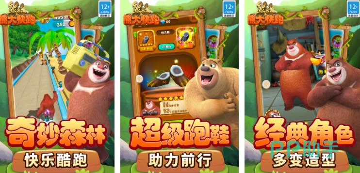 熊出没之熊大快跑一打开就是熟悉的狗熊岭场景,树木郁郁葱葱,光头强的木屋在树林里,熊大迈着憨厚的步子往前跑,身后还跟着追来的光头强,特别有动画里的感觉,玩的时候用手指滑动屏幕控制熊大,向上滑熊大就会跳起来,躲开路上的石头,向下滑它会趴在地上,钻过矮树杈,左右滑能让它换跑道,避开光头强设的陷阱。