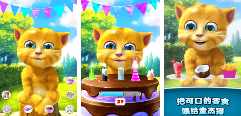金杰猫是汤姆猫家族的一名成员,在会说话的金杰猫第二部作品里,金杰猫已经长大,需要继续在这个竖屏场景中,和角色不断互动,角色每天都需要玩家精心照顾,可以亲自给猫咪喂食,清洁,可以给猫咪选择不同的服装,除了这种常规的操作之外,玩家还可以亲自给猫咪挑选玩具,可以让这个虚拟的猫咪陪伴自己。