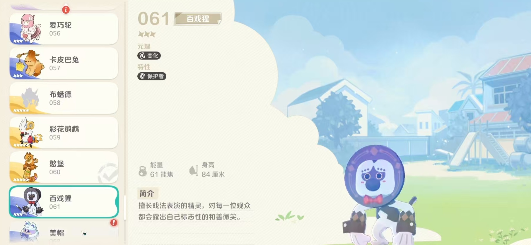 百戏猩属于典型的前排承伤型精灵,具备魔法伤害输出能力,其元理属性为“变化”,拥有“保护者”特性。这一特性决定了它在阵容中的角色定位——主要承担战场前排任务,吸收敌方攻击,保障后排输出单位的安全。因此,在构建防守体系时,百戏猩是一个值得考虑的选择。