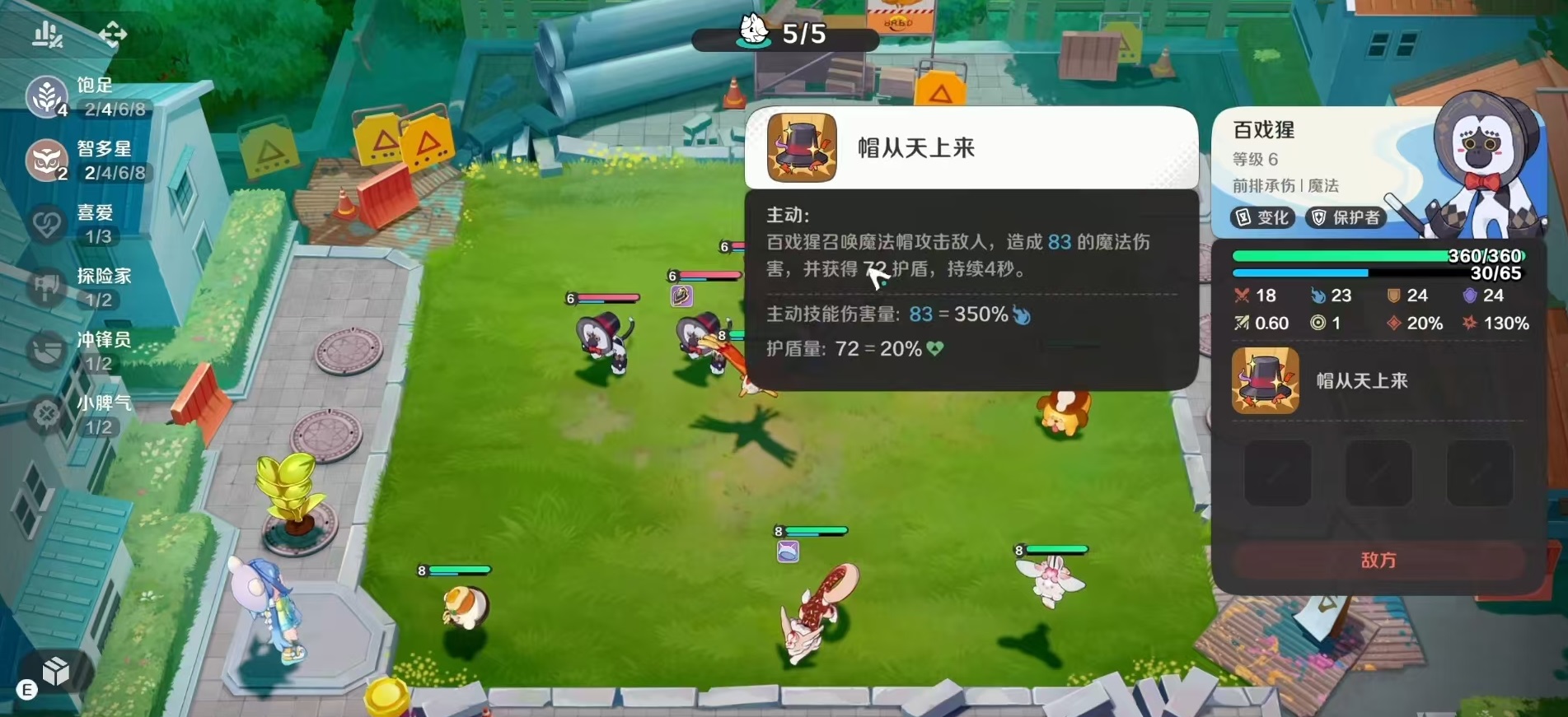 技能方面,百戏猩的主动技名为“帽从天上来”,释放后会召唤魔法帽对敌人造成350%魔法攻击力的伤害,并为自己生成一个持续4秒的护盾,护盾值相当于自身20%最大生命值。该技能兼具输出与防御功能,适合在战斗初期快速入场建立优势。因其召唤费用较低,常在前期频繁出现,是过渡阶段的重要战力。若后期不围绕“变化”体系构筑阵容,则其出场率可能有所下降。