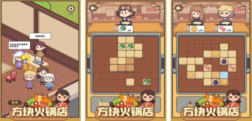 一般的经营游戏都需要玩家亲自制作食物,但是在方块火锅店这个游戏里,就通过消除的方式摆放这些方块,每次消除都可以获得对应的食材,收集足够的食材之后,玩家就可以招待这些顾客,除了食材通过消除还能收集大量的装饰材料,能让玩家翻新店铺,吸引更多食客。