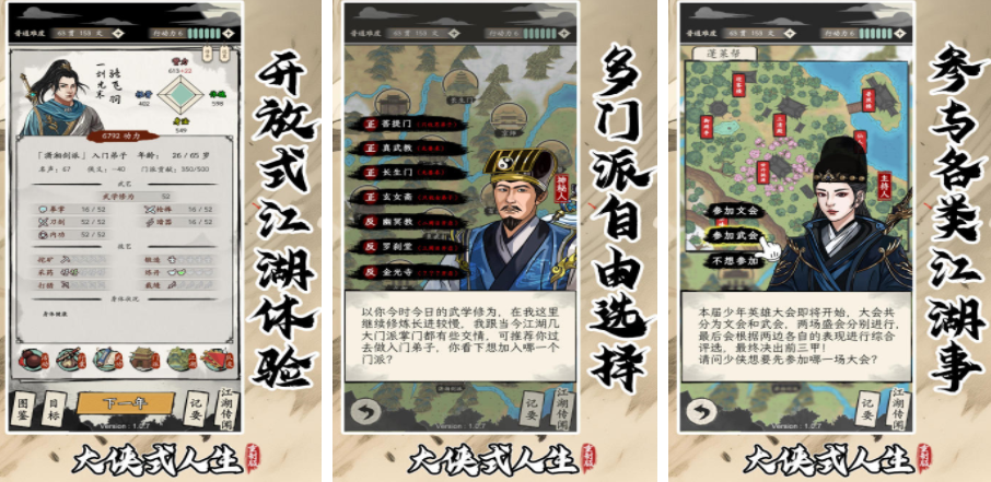 武侠江湖世界一直是很多人比较向往的,进入到古代江湖之后,玩家都能成为大侠,现在通过大侠式人生,玩家就可以模拟一名大侠,可以在这个水墨风格的场景,随机完成各类江湖事件,在这个过程中会涉及到开放江湖的探索,也可以在多个门派中抉择,除了能自由学习武功,参与各种大会挑战之外,玩家还可以感受多重随性的人生,玩家通过游戏,可以直观了解古代大侠。