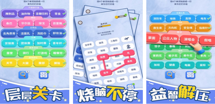 在日常生活中遍布着词语,脑洞词场会呈现出大量的词汇,玩家需要做的就是把类别相同的词汇移动到同一行,每一次挑战开启之后都会有大量的随机词汇出现,要仔细观察分辨这些词汇的意思,这样才能通过移动,顺利把这些词汇分类,开启新的关卡挑战,通过游戏,也能让玩家积累更多的词汇量。
