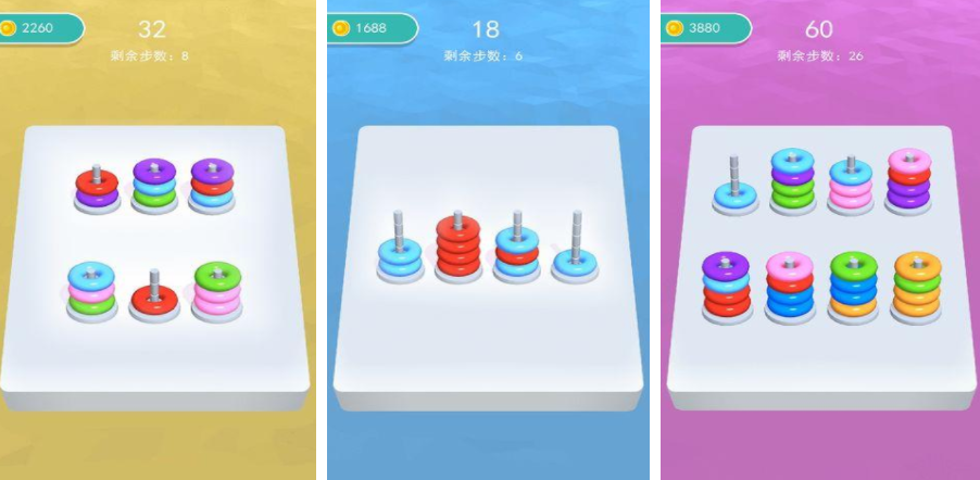 全民脑洞训练是一个比较锻炼玩家和动手能力的游戏,里面会有很多彩色圆环,需要用移动的方式把这些圆环进行分类,但是每一次移动圆环都会有步数的要求,大家要在移动之前不断进行思考,选择最合理的移动方式,这样才能在限定的步数内完成挑战,顺利通关,游戏会采用3d设定,能让玩家很有代入感。