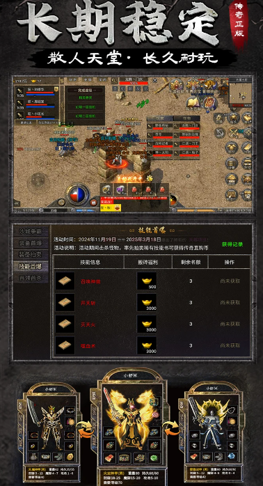 不管我们用手机还是电脑玩,这个游戏都能同步进度,换设备接着玩也不卡。游戏没丢经典版的玩法,以前大家爱打的攻城战和跟boss死磕的紧张劲都还在,玩起来还能找到当年的热血感。老玩家能随时喊上以前的队友组队,在熟悉的游戏里回忆过去,新玩家也能体验到最地道的传奇玩法。游戏走的是复古路线,可以随便选职业去冒险,能体验到最原始的传奇玩法,帮大家找回以前玩传奇的感觉。
