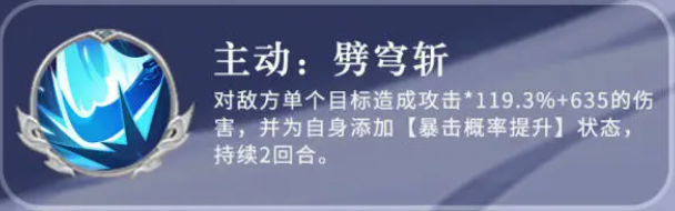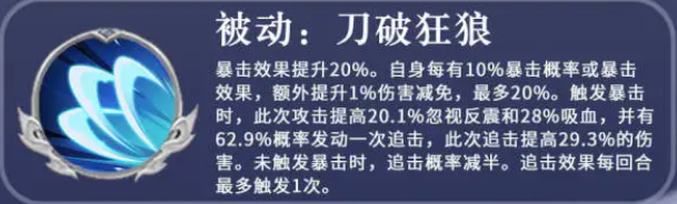 而他的被动技能叫做刀破狂狼,这个技能是给他自身的暴击带来额外提升的,此时提升了20%的暴击之后,他自身还会根据每10%的暴击概率,额外提升1%的伤害减免,当然这个百分比最多是可以叠加到20%的,再提升到20%伤害减免之后,他就无法再进行叠加了,如果这个被动触发了暴击的话,那么此时攻击提升的数值会有20%,最后的数值可以忽视反震,而且他会带来一个吸血的效果,并且有62%左右的概率发动一次追击的能力,这一次追击的话,还会提升自身29%的伤害数值,如果这个技能没有触发暴击的话,那么追击触发的概率就会减掉一半,这里的追击效果其实在每一个回合里面都是可以进行尝试触发的,但是一个回合只最多只能用一次。